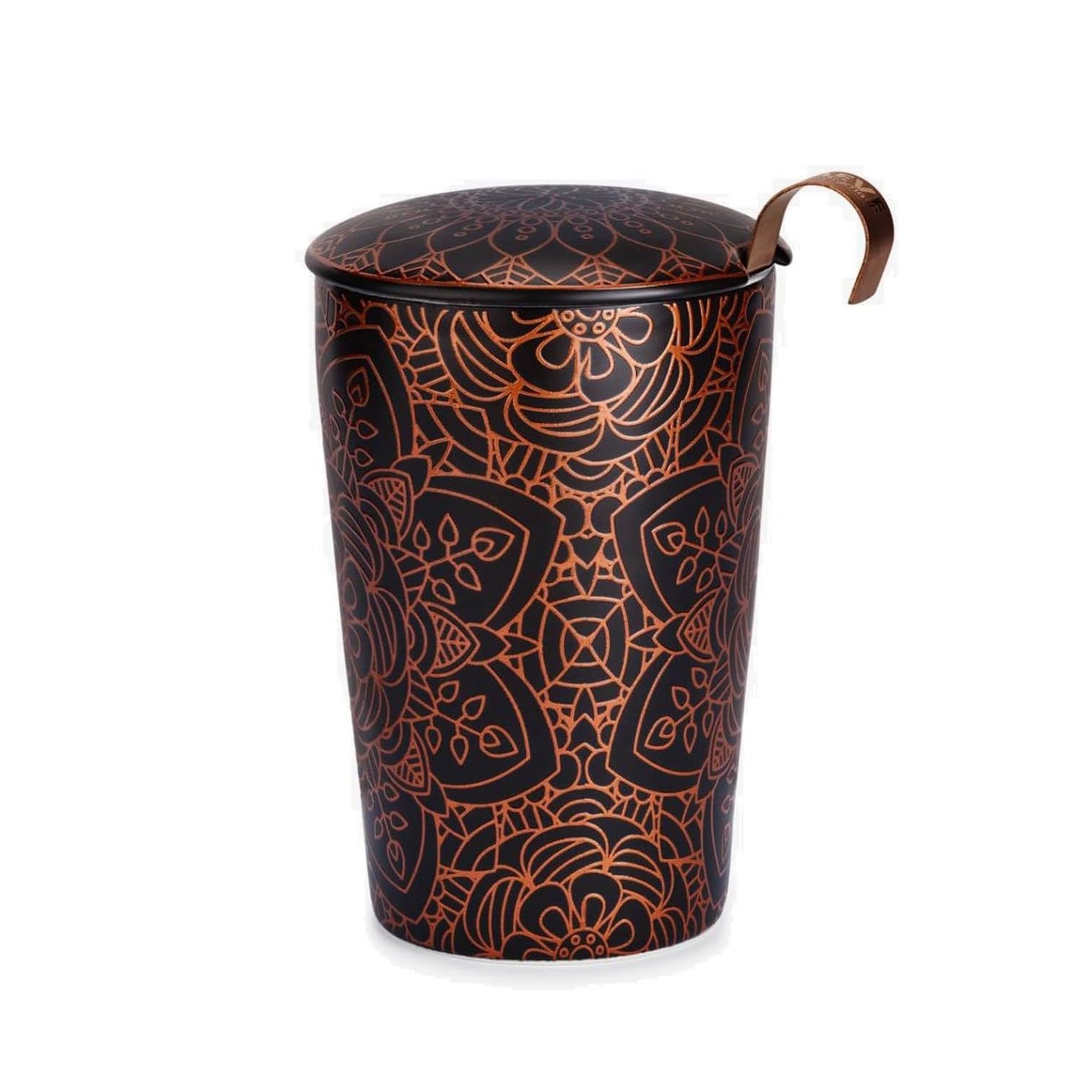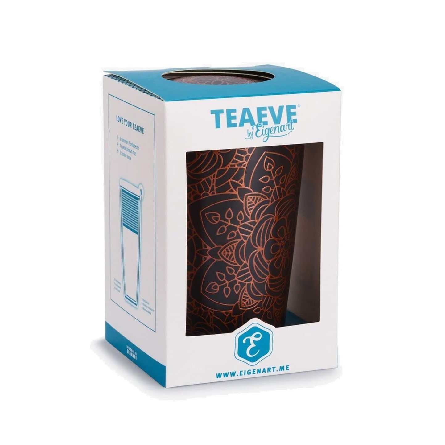 La Taza Teaeve Mandala Negro de la marca Eigenart es una taza de doble pared de porcelana, con tapa, y que además incluye un filtro de acero inoxidable para preparar cómodamente tus infusiones preferidas.