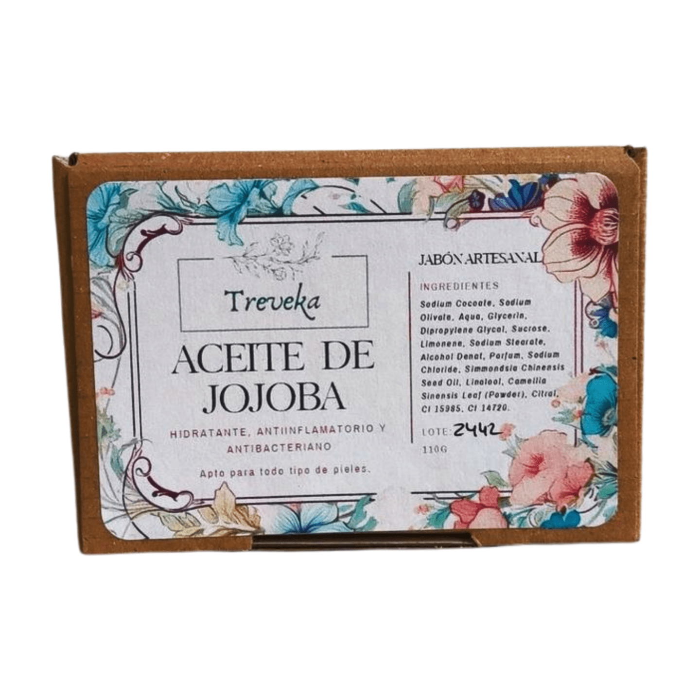 Jabón con aceite de jojoba artesano zero waste con aroma floral, con aceite de oliva y coco saponificados en frío. Aumenta la circulación a nivel superficial de la piel y mejora las lesiones producidas por el acné o la psoriasis debido a sus propiedades antiinflamatorias. Jabón natural, sin detergente y vegano.