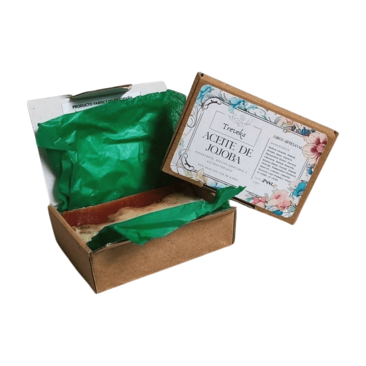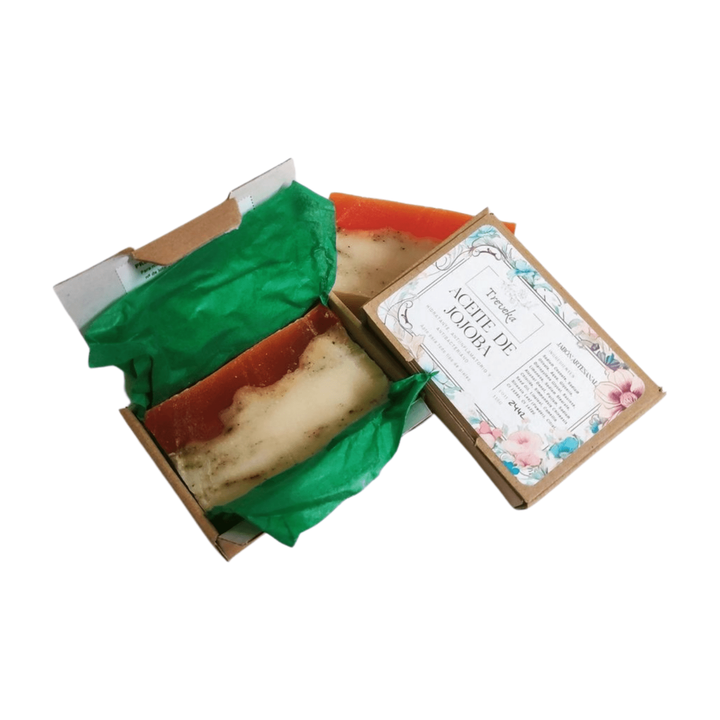 El diseño del jabón artesano con aceite de jojoba es muy atractivo porque combina una parte de jabón veteado de colore natural con una capa de glicerina vegetal de color naranja oscuro. El aroma es agradable, floral/herbal que puede usar toda la familia.