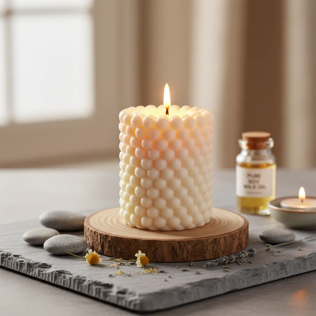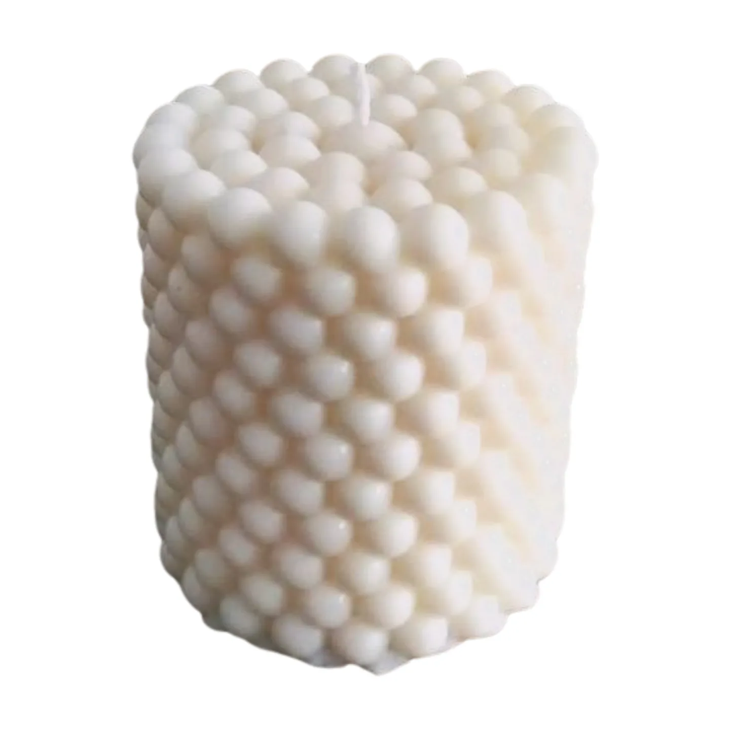 Vela artesanal decorativa “Perlas”, elaborada con cera de soja natural. Diseño moderno en forma de burbujas que parecen perlas, perfecta para decorar o crear ambiente. Vegana, hecha a mano y de combustión limpia.